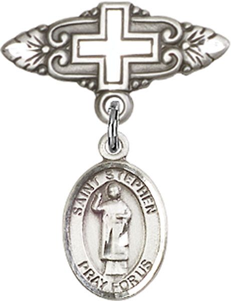 Sterling Silver Baby Badge with St. Stephen the Martyr Charm and Badge Pin With Cross