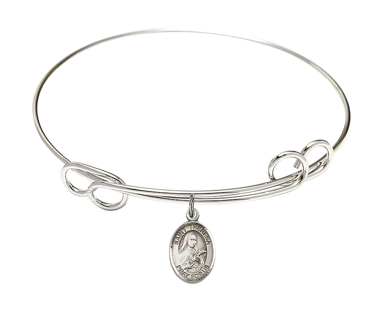 Our 7 1/2 inch Round Double Loop Rhodium Bangle Bracelet with a Sterling Silver St. Theresa charm. is proudly manufactured in the USA.