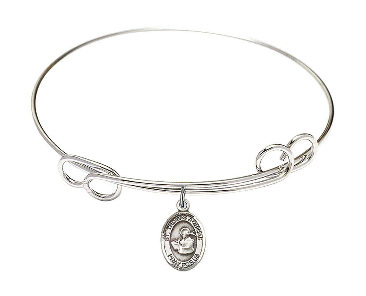 Our 7 1/2 inch Round Double Loop Rhodium Bangle Bracelet with a Sterling Silver St. Thomas Aquinas charm. is proudly manufactured in the USA.