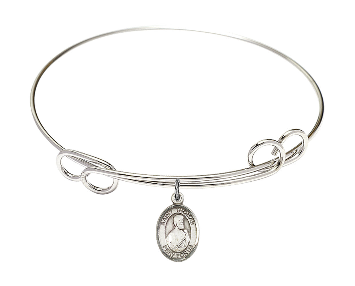 7.5-inch Round Double Loop Rhodium Bangle Bracelet | Sterling Silver St. Thomas the Apostle Charm | Engravable