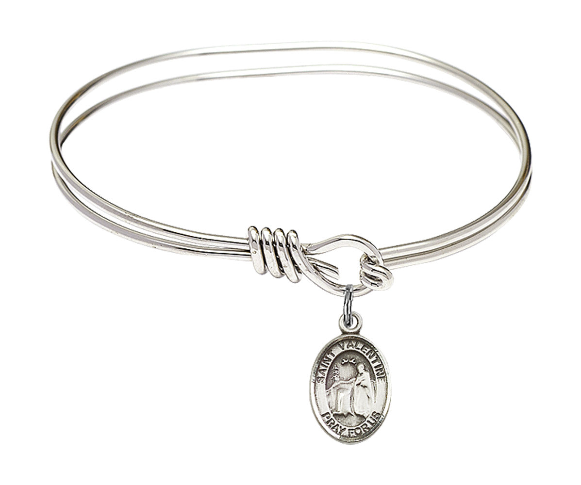 5 3/4-inch Eye Hook Rhodium Bangle Bracelet | Sterling Silver St. Valentine of Rome Charm | Engravable