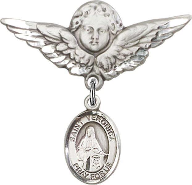 Sterling Silver Baby Badge with St. Veronica Charm and Large Angel w/Wings Badge Pin