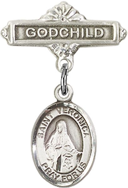 Sterling Silver Baby Badge with St. Veronica Charm and Godchild Badge Pin