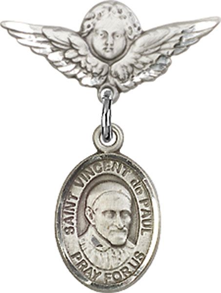 Sterling Silver Baby Badge with St. Vincent de Paul Charm and Small Angel w/Wings Badge Pin