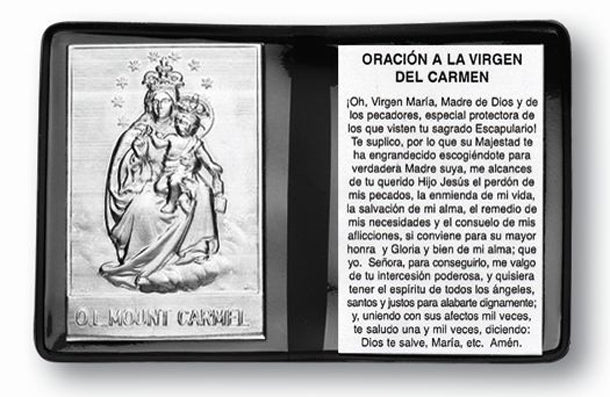Ol Mt Carmel Plaque In Folder Spanish 10-Pack is a beautiful way to deepen your devotion to Our Lady of Mount Carmel. Each plaque measures 2.5 inches x 4 inches and comes housed in a luxurious grained leatherette folder equipped with clear soft acetate pockets. Inside, you'll find an exquisite Italian-made metal plaque alongside a heartfelt prayer, perfect for personal reflection or sharing with loved ones.