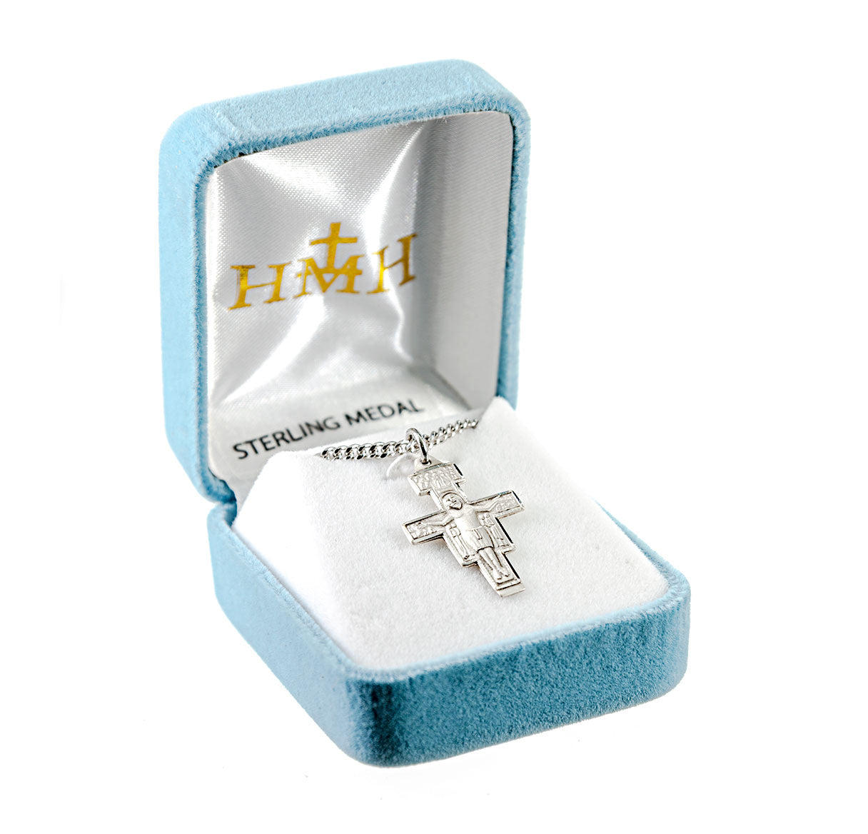 This 15/16-inch Sterling Silver San Damiano Crucifix with 18-inch Chain is made in the USA.