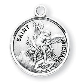 7/8-inch Sterling Silver St. Michael Medal Made in the USA. The Round Shaped Medal with Enameled Lettering is adorned with a Depiction of St. Michael Slaying Lucifer.