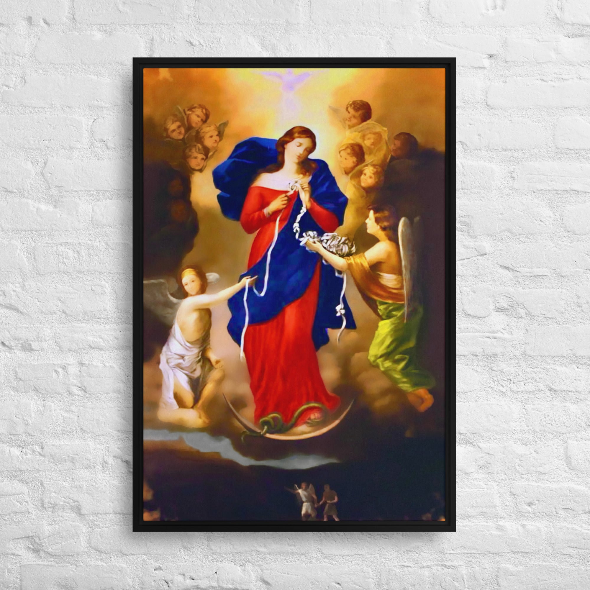 Our digitally-restored version of the Undoer of Knots painting is presented here on a high-quality canvas print. Please note that the largest option shows more of the painting's top and bottom, while the rest are slightly cropped to feature more of the painting's focus: Our Lady.