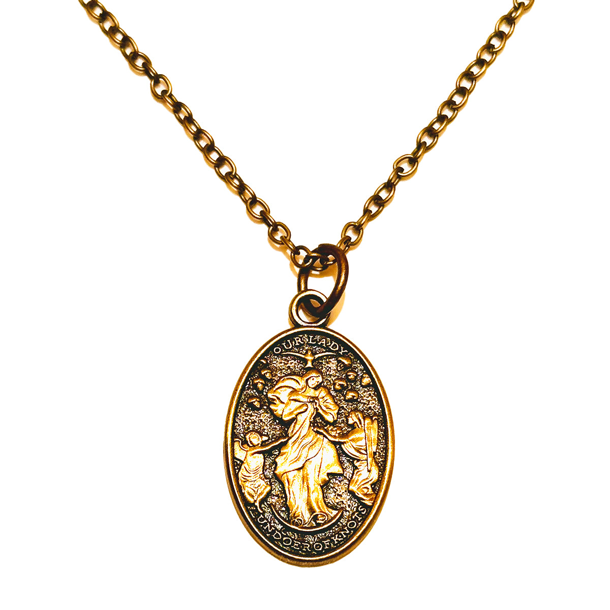 The front of the medal features the devotion's title "Our Lady Undoer of Knots." The back reads "Untie the knots that bind me."