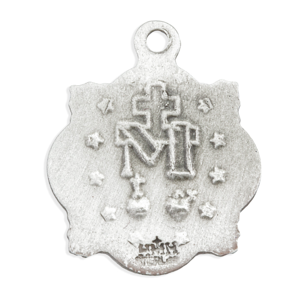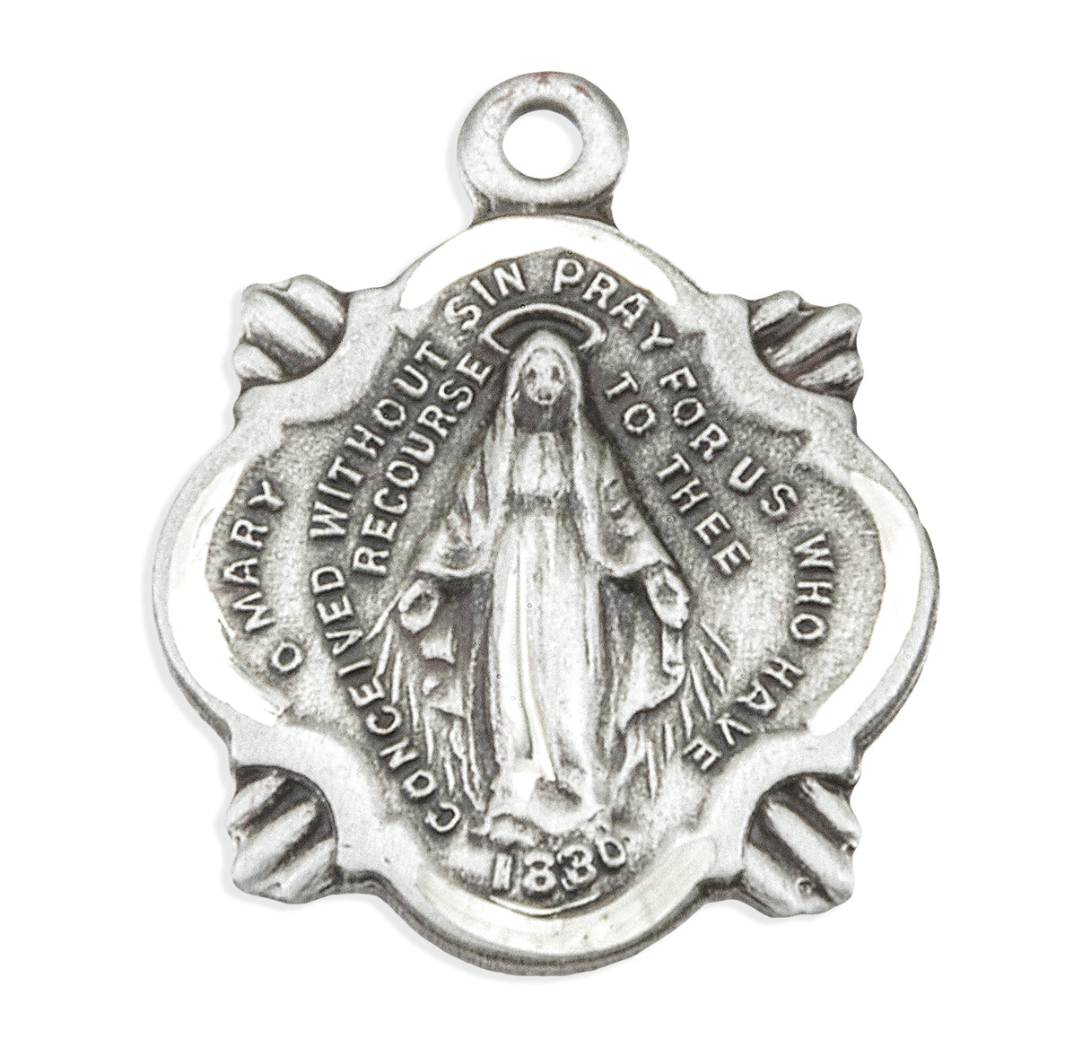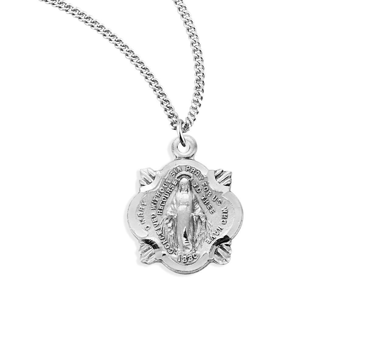 5/8-inch Sterling Silver Miraculous Medal, made in the USA. The Traditional Shape with Four Rays of Light around Fancy Border is Adorned with finely detailed Blessed Mother Mary with rays coming out of her extended hands. The Reverse Side of the Medal Portrays an "M" with a Cross on the top and the "Sacred Hearts" underneath surrounded by Twelve Stars.