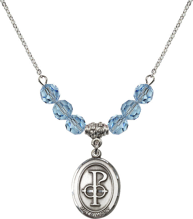 Our 18" Rhodium Plated Necklace with 4mm Aqua Crystal Beads featuring a Sterling Silver Matrimony Medal. is proudly manufactured in the USA.