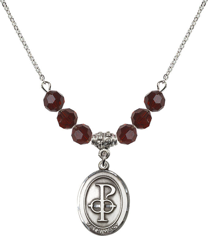 Our 18" Rhodium Plated Necklace with 4mm Garnet Crystal Beads featuring a Sterling Silver Matrimony Medal. is proudly manufactured in the USA.