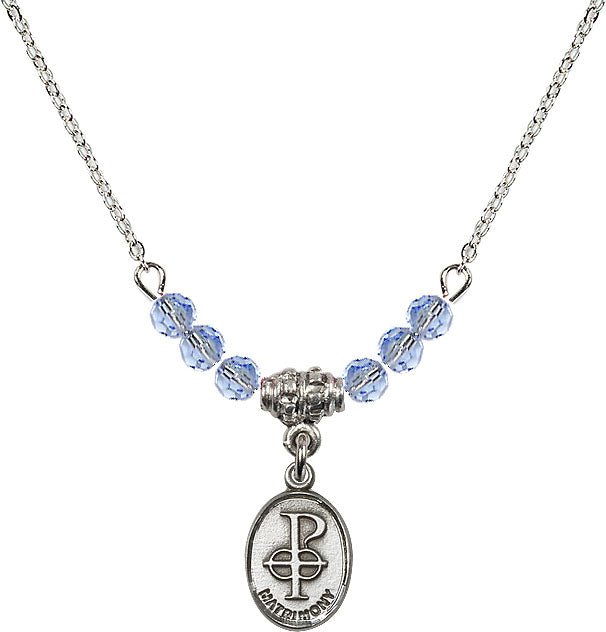 Our 18" Rhodium Plated Necklace with 4mm Light Sapphire Crystal Beads featuring a Sterling Silver Matrimony Medal. is proudly manufactured in the USA.