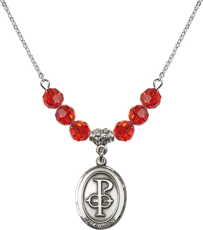 Our 18" Rhodium Plated Necklace with 4mm Ruby Crystal Beads featuring a Sterling Silver Matrimony Medal. is proudly manufactured in the USA.