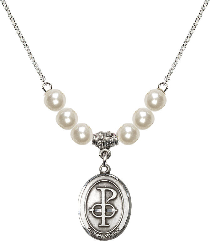 Our 18" Rhodium Plated Necklace with 6mm Faux-Pearl Beads featuring a Sterling Silver Matrimony Medal. is proudly manufactured in the USA.