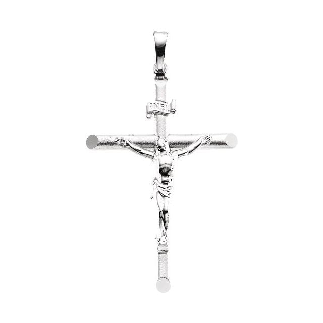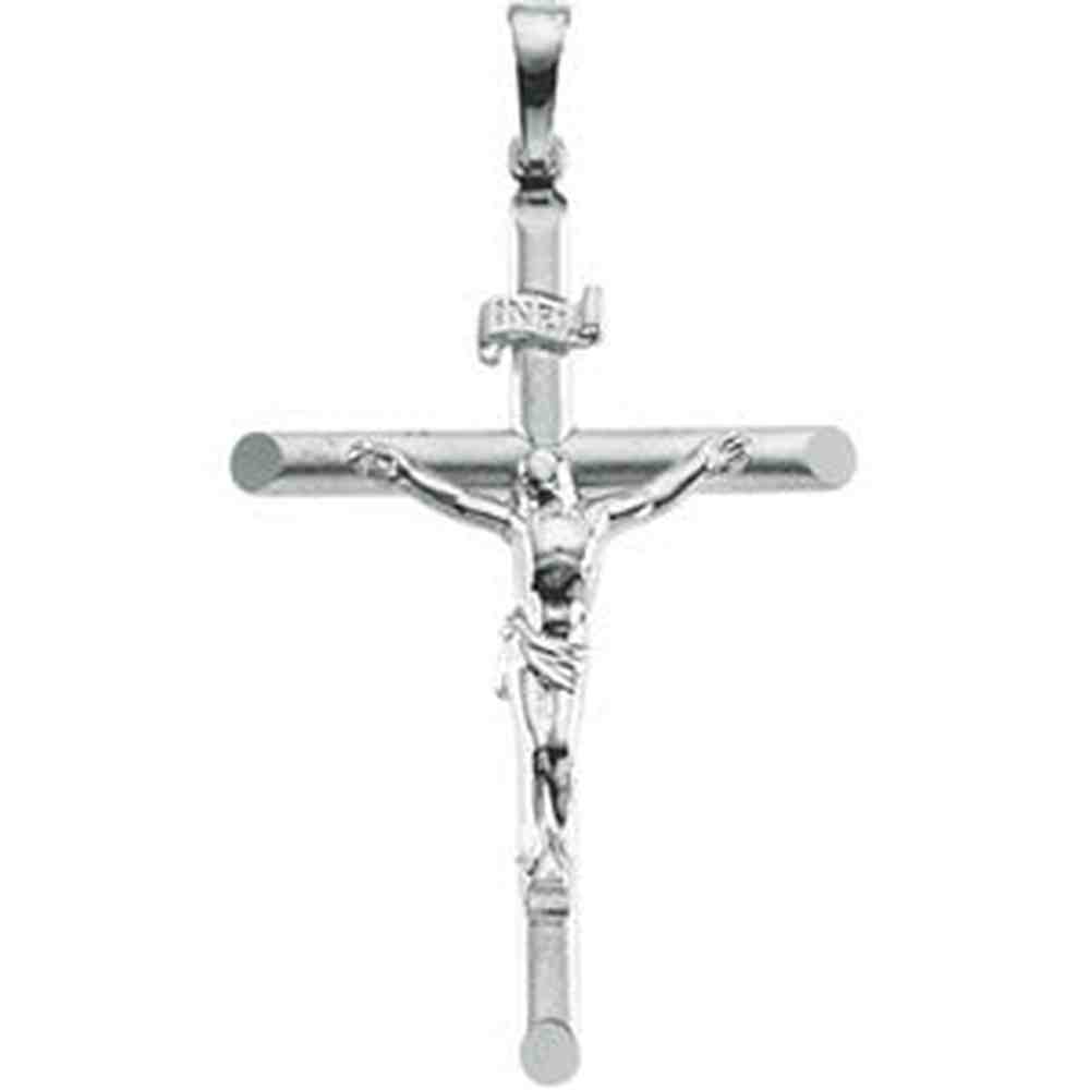 This Crucifix Pendant available from Catholic Shop.com features dimensions of 35.0 X 25.0 millimeters, approximately 1.38-inches by 1-inch.