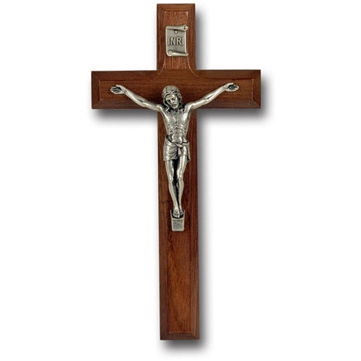7" Walnut Cross With Antique Silver Corpus is a beautiful and meaningful addition to your home or prayer space. Crafted from rich walnut wood and adorned with an antique silver plated corpus, this cross serves as a daily reminder of Christ's sacrifice and love. Measuring 7 inches, it fits perfectly on a wall, desk, or altar, inspiring meditation and prayer.