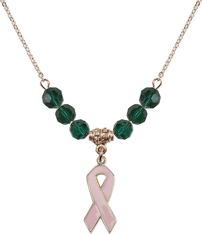 Gold-Plated Necklace with 4mm Emerald Crystal Beads & 14K-Filled Cancer Awareness Medal