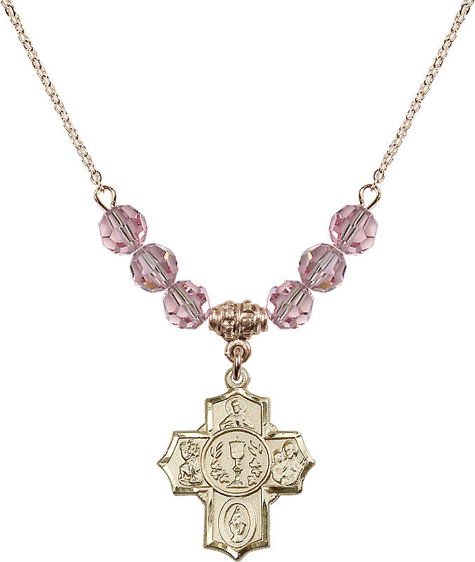 Gold-Plated Necklace with 4mm Light Rose Crystal Beads & 14K-Filled Communion/5-Way Medal