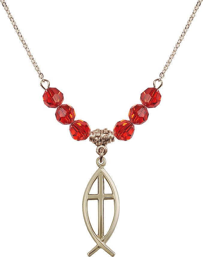 Gold-Plated Necklace with 4mm Ruby Crystal Beads & 14K-Filled Fish / Cross Medal