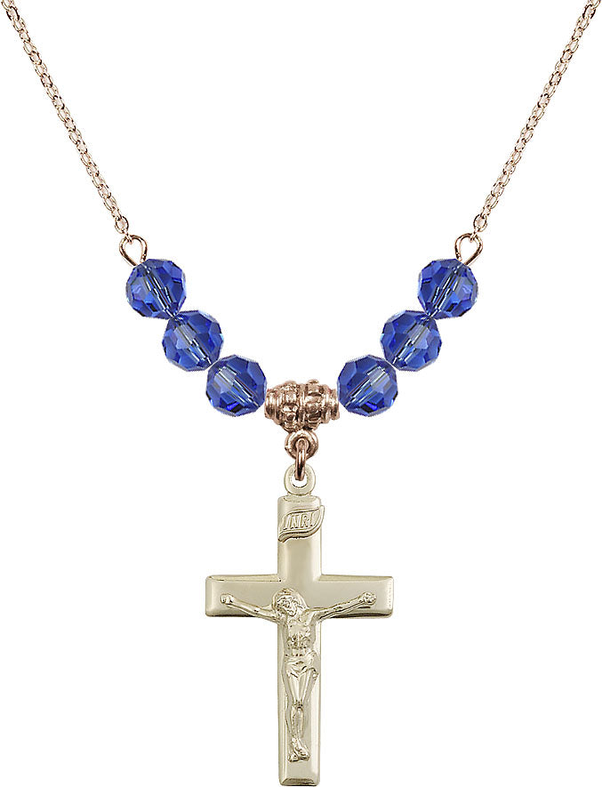 Our 18" Hamilton Gold Plated Necklace with 4mm Sapphire Crystal Beads featuring a 14kt Gold Filled Crucifix Medal. is proudly manufactured in the USA.