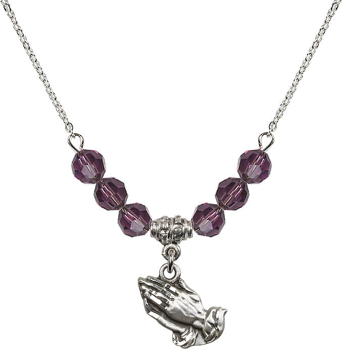 Our 18" Rhodium Plated Necklace with 4mm Amethyst Crystal Beads featuring a Sterling Silver Praying Hands Medal. is proudly manufactured in the USA.
