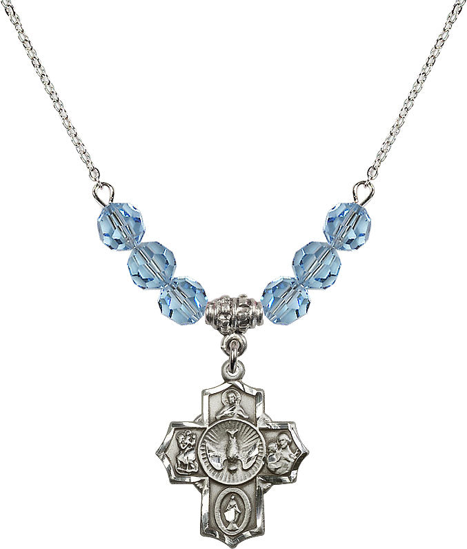 Our 18" Rhodium Plated Necklace with 4mm Aqua Crystal Beads featuring a Sterling Silver 5-Way Medal. is proudly manufactured in the USA.
