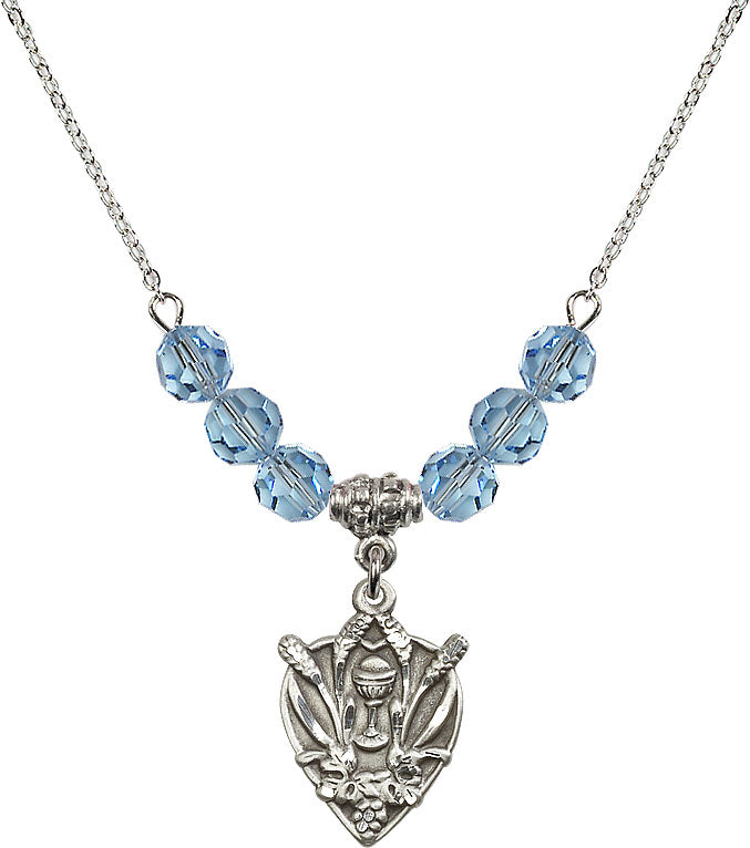 Our 18" Rhodium Plated Necklace with 4mm Aqua Crystal Beads featuring a Sterling Silver Communion Medal. is proudly manufactured in the USA.