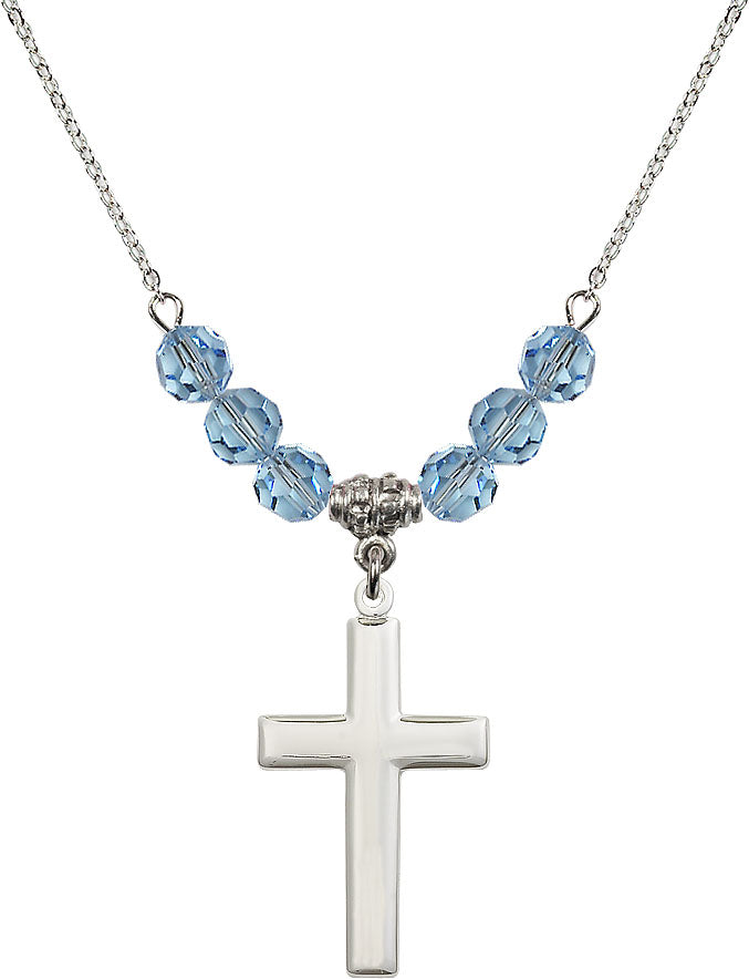 Our 18" Rhodium Plated Necklace with 4mm Aqua Crystal Beads featuring a Sterling Silver Cross Medal. is proudly manufactured in the USA.