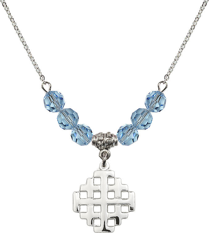 Our 18" Rhodium Plated Necklace with 4mm Aqua Crystal Beads featuring a Sterling Silver Jerusalem Cross Medal. is proudly manufactured in the USA.