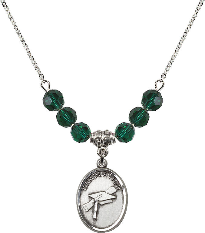 Our 18" Rhodium Plated Necklace with 4mm Emerald Crystal Beads featuring a Sterling Silver Graduation Medal. is proudly manufactured in the USA.