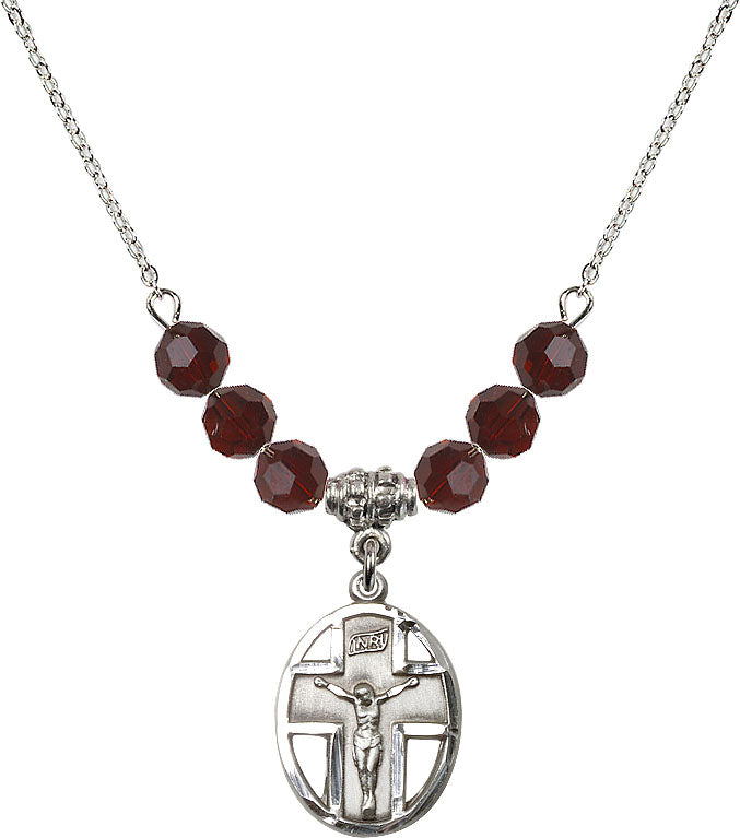 Our 18" Rhodium Plated Necklace with 4mm Garnet Crystal Beads featuring a Sterling Silver Crucifix Medal. is proudly manufactured in the USA.