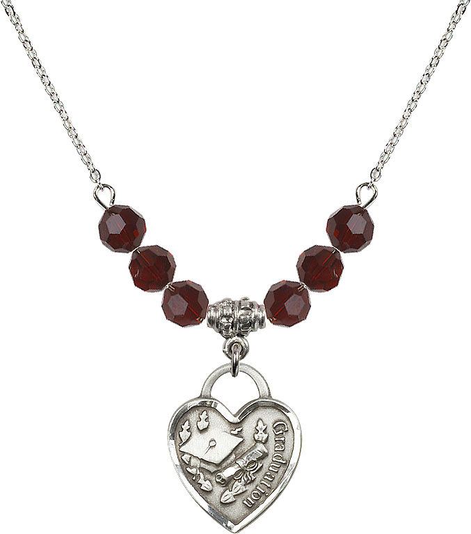Our 18" Rhodium Plated Necklace with 4mm Garnet Crystal Beads featuring a Sterling Silver Graduation Heart Medal. is proudly manufactured in the USA.