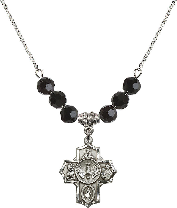 Our 18" Rhodium Plated Necklace with 4mm Jet Crystal Beads featuring a Sterling Silver 5-Way Medal. is proudly manufactured in the USA.