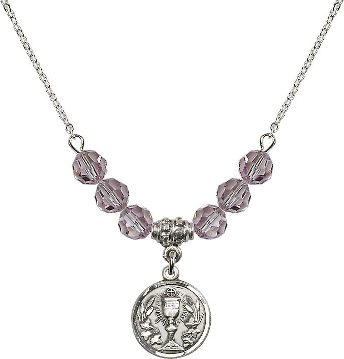 Our 18" Rhodium Plated Necklace with 4mm Light Amethyst Crystal Beads featuring a Sterling Silver Communion Chalice Medal. is proudly manufactured in the USA.