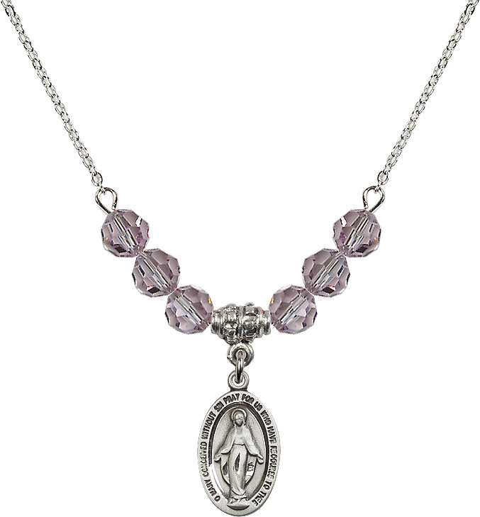 Our 18" Rhodium Plated Necklace with 4mm Light Amethyst Crystal Beads featuring a Sterling Silver Miraculous Medal. is proudly manufactured in the USA.