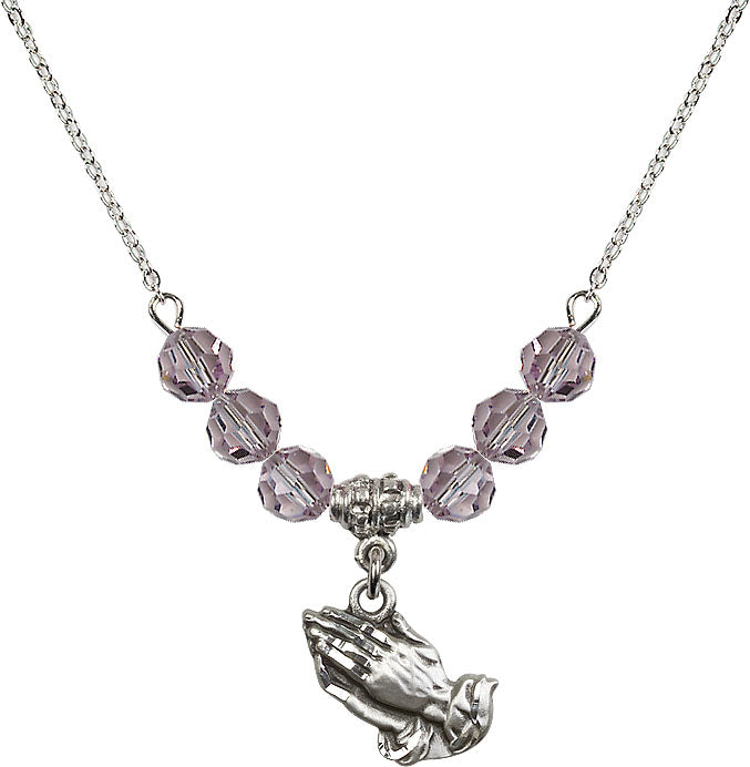 Necklace with 4mm Light Amethyst Crystal Beads & Sterling Praying Hands Medal