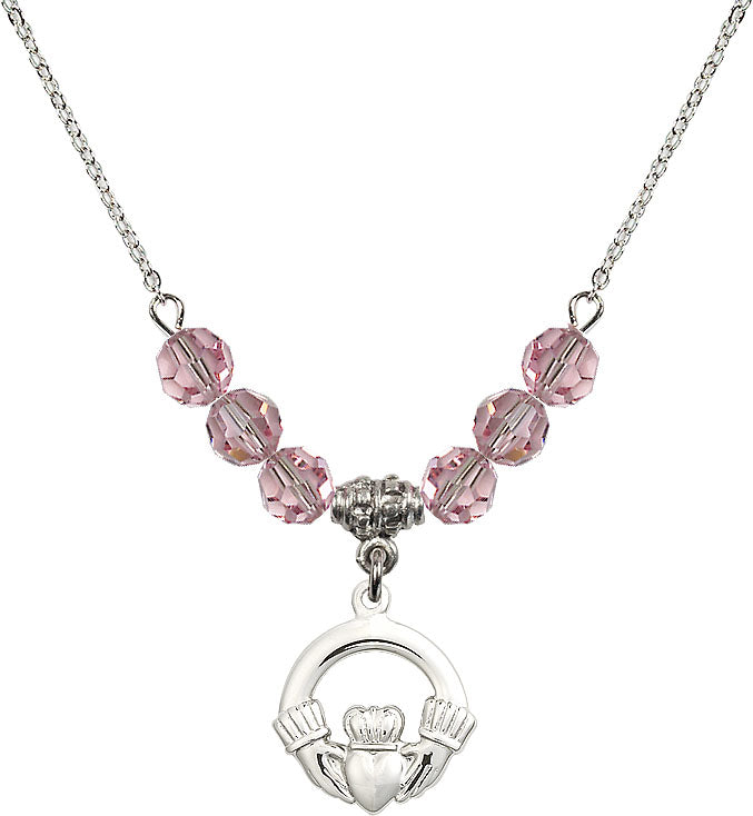 Our 18" Rhodium Plated Necklace with 4mm Light Rose Crystal Beads featuring a Sterling Silver Claddagh Medal. is proudly manufactured in the USA.