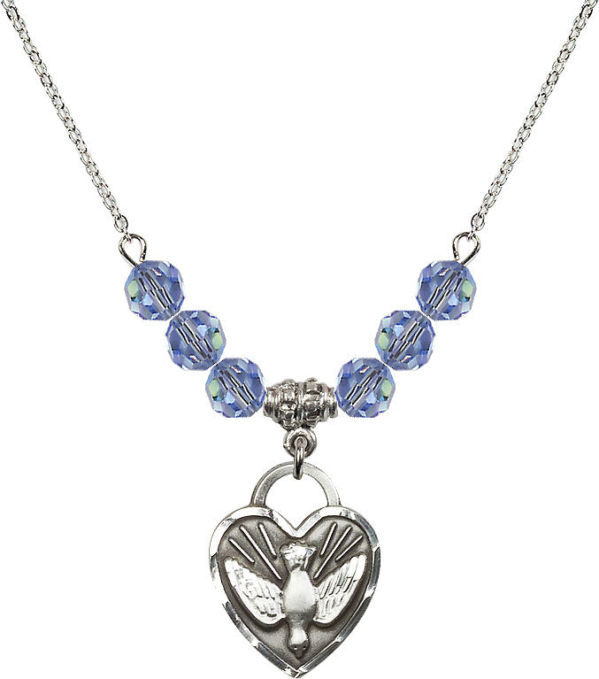 Necklace with 4mm Light Sapphire Crystal Beads & Sterling Confirmation Heart Medal | Engravable