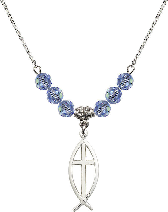 Our 18" Rhodium Plated Necklace with 4mm Light Sapphire Crystal Beads featuring a Sterling Silver Fish / Cross Medal. is proudly manufactured in the USA.