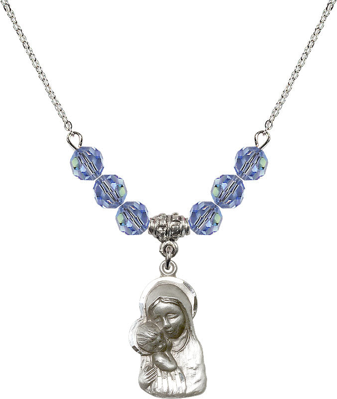 Our 18" Rhodium Plated Necklace with 4mm Light Sapphire Crystal Beads featuring a Sterling Silver Madonna and Child Medal. is proudly manufactured in the USA.