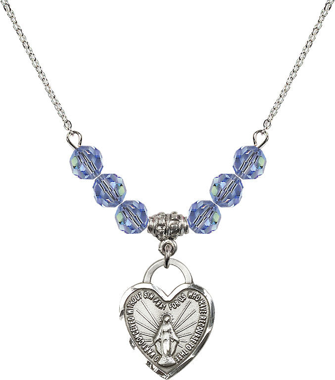 Our 18" Rhodium Plated Necklace with 4mm Light Sapphire Crystal Beads featuring a Sterling Silver Miraculous Heart Medal. is proudly manufactured in the USA.