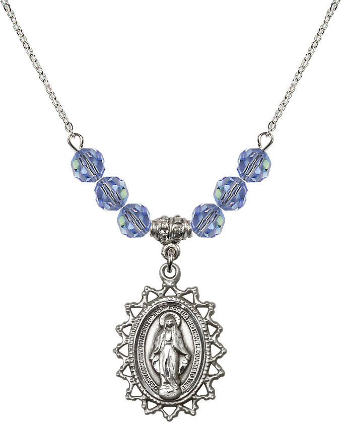 Necklace with 4mm Light Sapphire Crystal Beads & Sterling Miraculous Medal