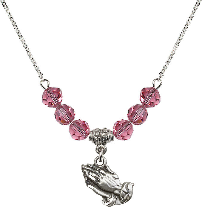 Necklace with 4mm Rose Crystal Beads & Sterling Praying Hands Medal
