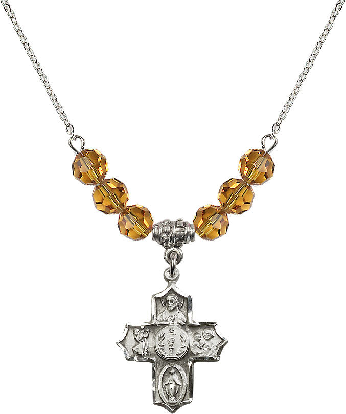 Our 18" Rhodium Plated Necklace with 4mm Topaz Crystal Beads featuring a Sterling Silver 4-Way Medal. is proudly manufactured in the USA.