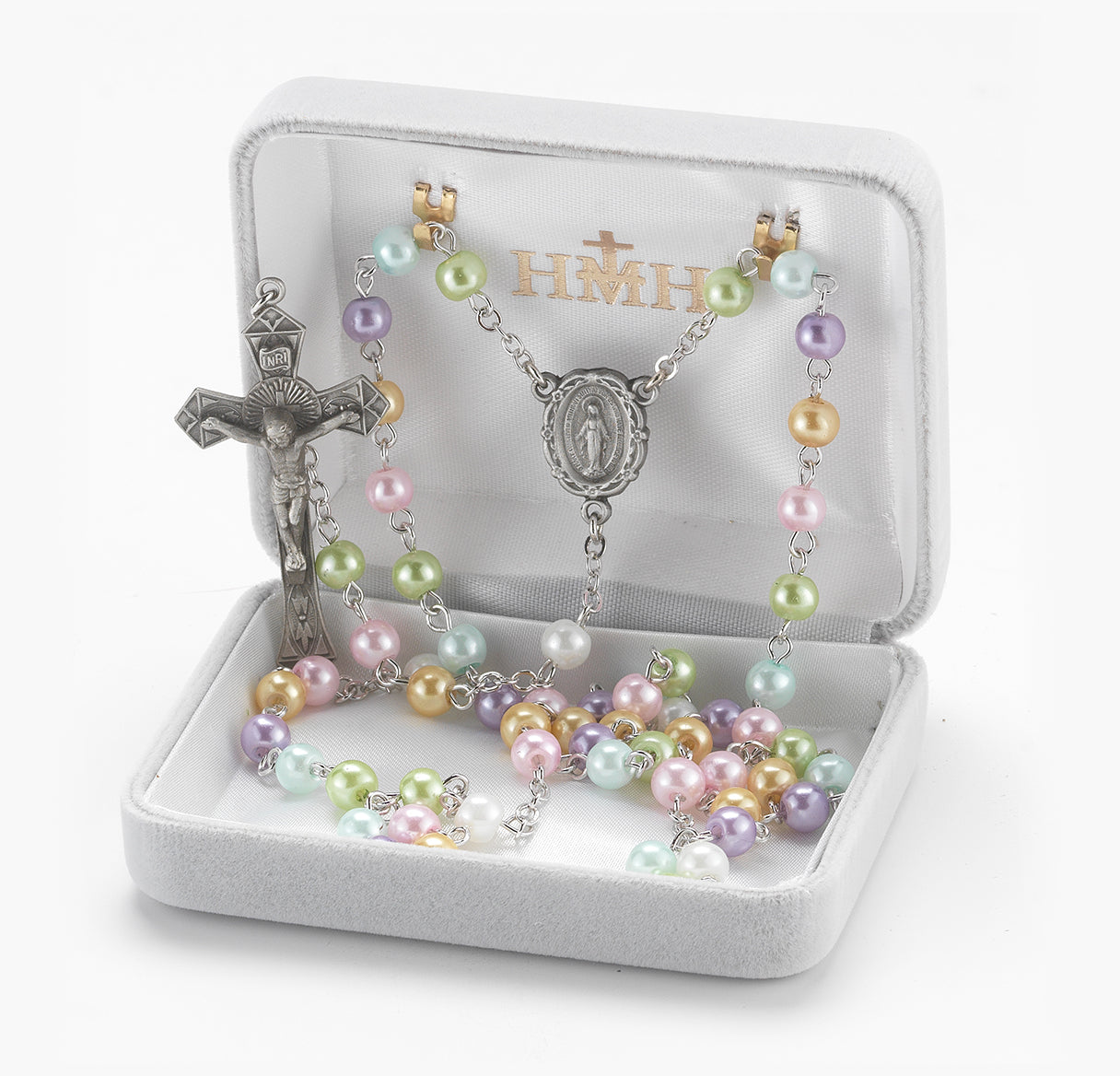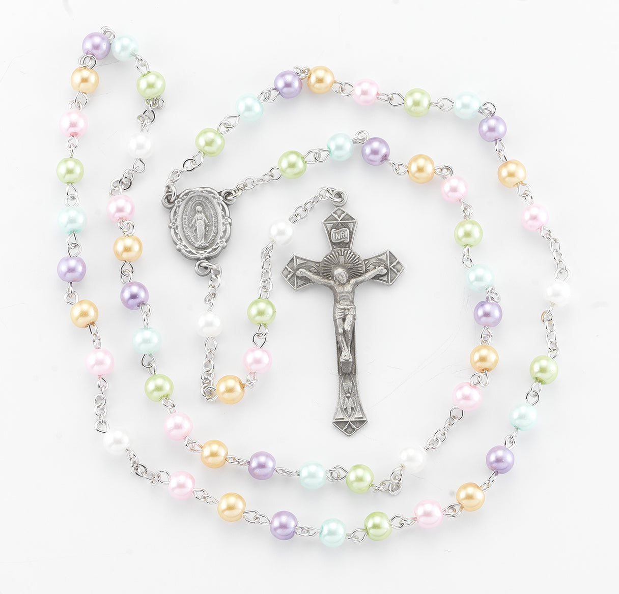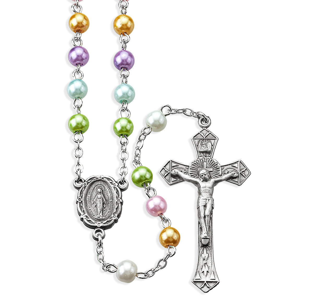 6mm Pearlized Multi-Color Beads with Pewter Crucifix and Center