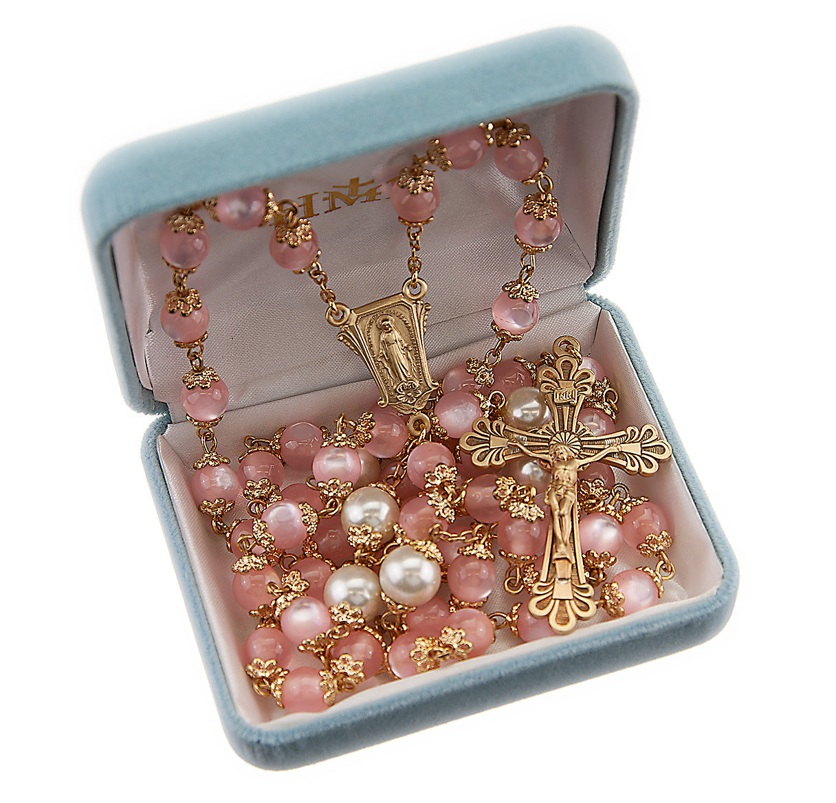 Each rosary is made in the USA and arrives in a deluxe velvet presentation box, making it perfect for gift-giving or personal devotion. The luminous rose-toned beads paired with the detailed brass components create a rosary of exceptional quality and timeless beauty.