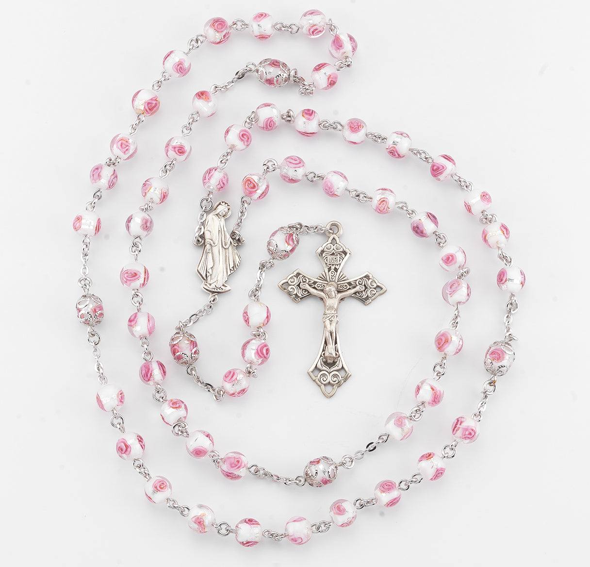8mm Pink Rose Embedded Glass Beads with Double Capped "Our Father" Beads