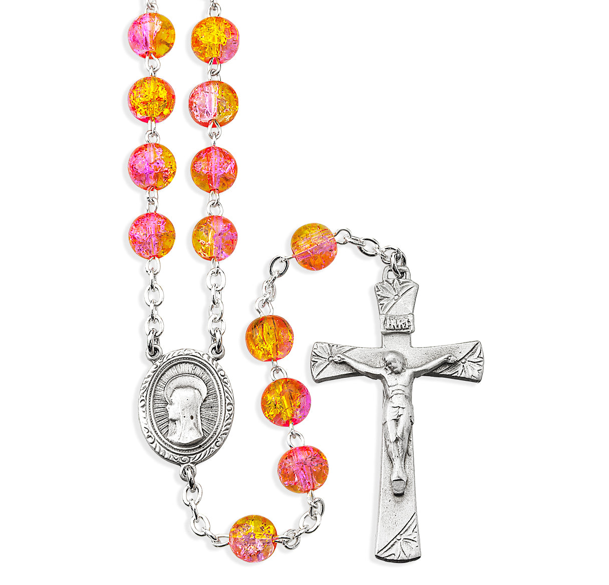 This beautiful handcrafted rosary features 8mm pink and yellow crackle glass beads that create a warm, luminous appearance perfect for daily prayer. Each Our Father bead is elegantly adorned with rhinestone caps, while the decade beads are connected with durable silver-plated brass wire and chain. The rosary showcases an exclusive Sacred Heart of Jesus center in genuine pewter, paired with a matching pewter crucifix, both designed with exceptional detail and craftsmanship.