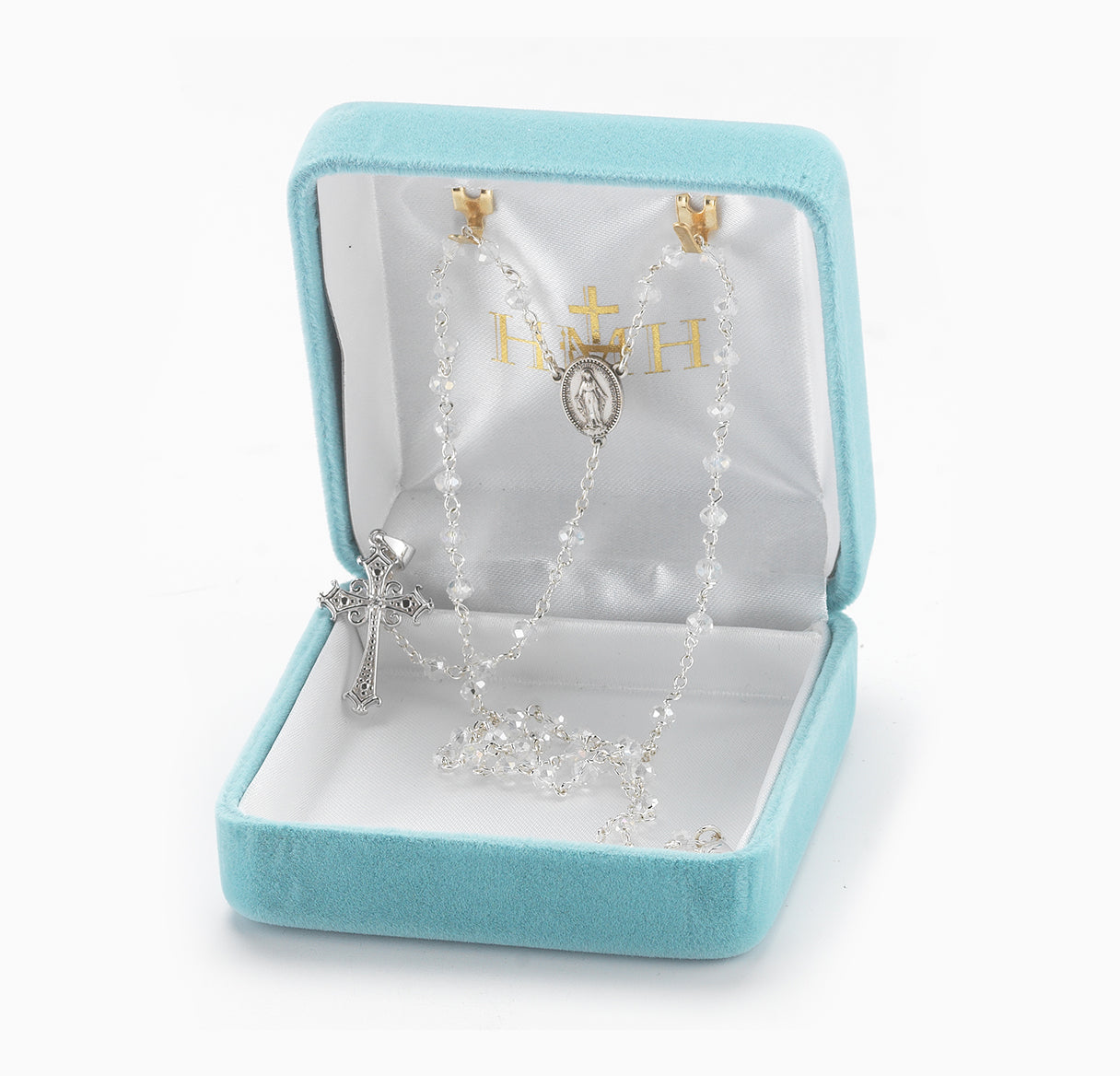 Clear Crystal Bead Sterling Silver Rosary Necklace